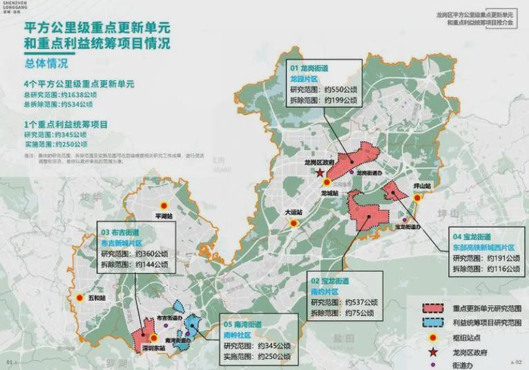4个平方公里级重点更新单元总研究范围约1638公顷,总拆除范围约534公顷,分别是:龙岗街道龙园片区重点更新单元、宝龙街道南约片区重点更新单元、布吉街道布吉新城片区重点更新单元、宝龙街道东部高铁新城西片区重点更新单元。