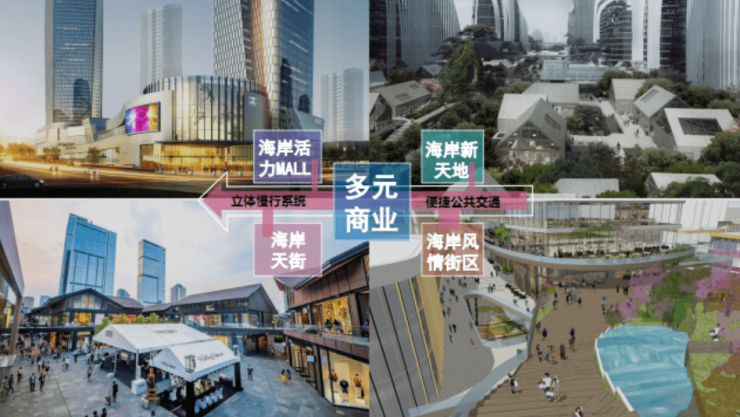 活力街区:融合高端居住、商业百货、零售餐饮、文化娱乐、星级酒店等业态,打造海岸购物中心、海岸天街、海岸新天地和海岸风情街区四个主题组团。