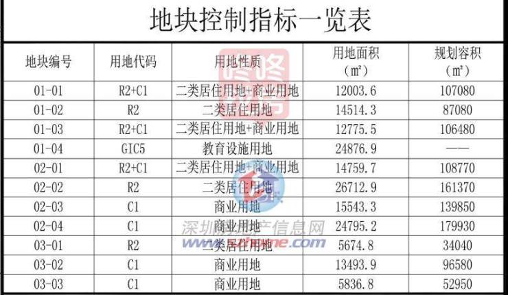 规划地块控制指标,分为三个二类居住用地+商业用地、3块纯二类居住用地、4块商业用地及一块教育用地。