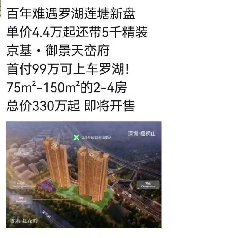 9月29日获批备案的京基御景天峦府,项目在开盘前已启动渠道转介,昨天朋友圈被中介的“总价330万起,首付99万起买罗湖”刷屏。而京基御景天峦府的备案较低总价386万起,单价5万/㎡起,从宣传来看,相当于开盘折扣给到了85-88折。