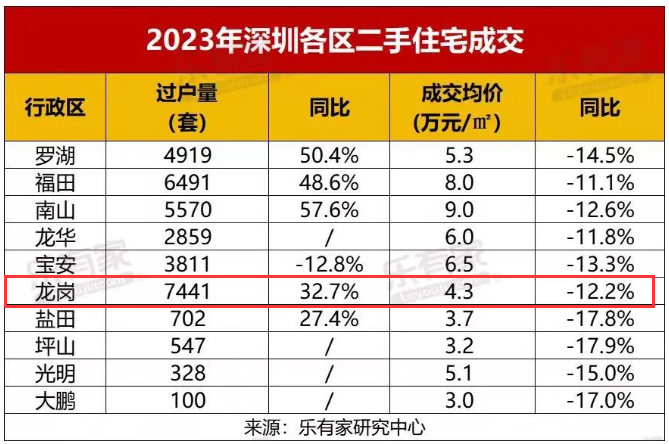 得益于市场广阔,龙岗的二手房市场相对更为活跃,2023年龙岗过户量7441套二手房,居于全市第一,与第二名的福田相差近千套。