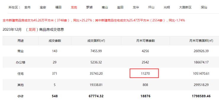 虽然近两年新房供应下滑,但是库存压力却不断攀升。截至2023年12月31日,深圳商品房可售套数51697套,仅龙岗区就有11270套,占全市库存约22%。