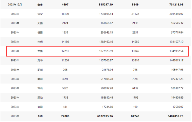 在过去的2023年供应量略显疲软,龙岗区共新批准住宅房源共12251套,远少于同样为“大区”的宝安。
