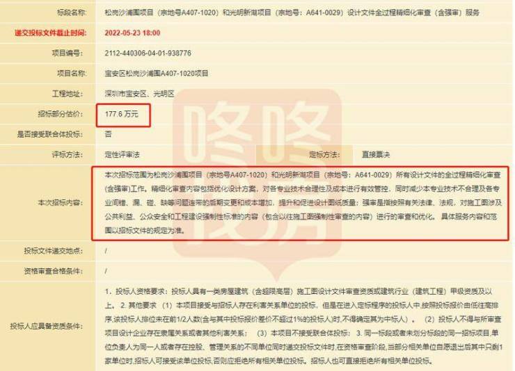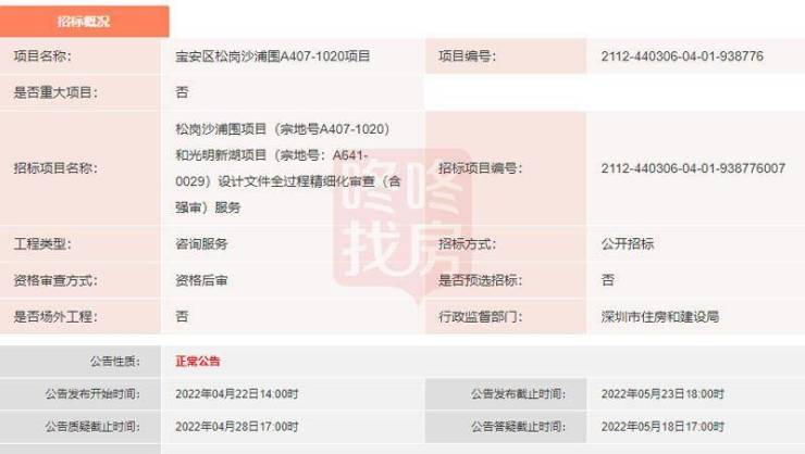 近日,深圳住建官网发布松岗沙浦围项目(宗地号A407-1020)和光明新湖项目(宗地号:A641-0029)设计文件全过程精细化审查(含强审)服务公告。