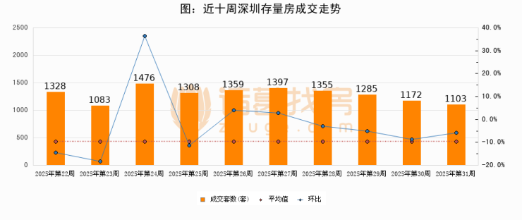 存量房方面,第31周深圳存量房成交1103套,较上周减少69套,环比下降5.9%。从近十周成交走势来看,周均成交套数为1286套,本周低于平均水平14.2%。