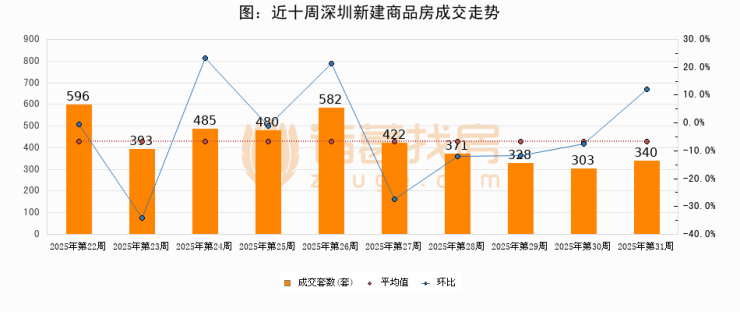 进入2025年第31周(07月28日-08月03日),深圳新建商品房成交340套,较上周增加37套,环比上涨12.2%