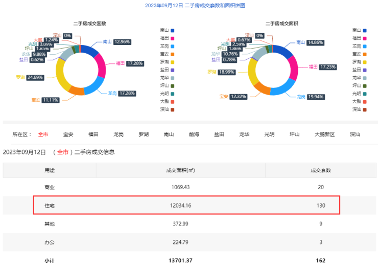 9月12日二手房住宅网签130套。宝安17套;福田25套;龙岗26套;罗湖19套;南山19套;盐田1套;龙华16套;光明3套;坪山3套;大鹏1套。
