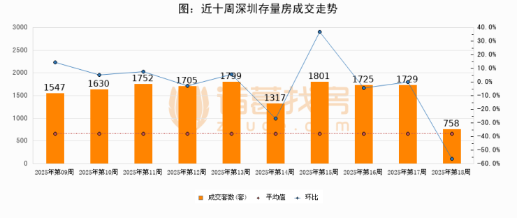 存量房方面,第18周深圳存量房成交758套,较上周减少971套,环比下降56.2%。从近十周成交走势来看,周均成交套数为1576套,本周低于平均水平51.9%。
