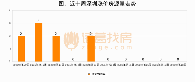 从调价房源来看,第18周深圳涨价房源0套,较上周持平。与此同时,18周涨价房源占比回落100个百分点,业主信心小幅波动,购房者可则需入市。