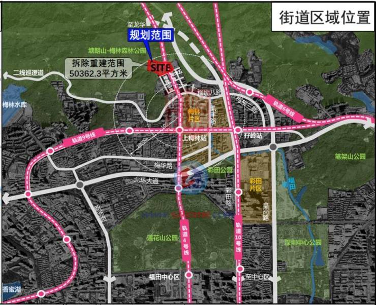 福田区梅林街道鸿发批发市场城市更新单元位于梅坳五路以北,紧邻塘朗山-梅林森林公园。