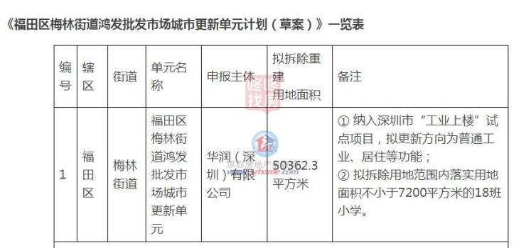 9月25日,深圳福田区城市更新和土地整备局发布关于《福田区梅林街道鸿发批发市场城市更新单元计划(草案)》公示。