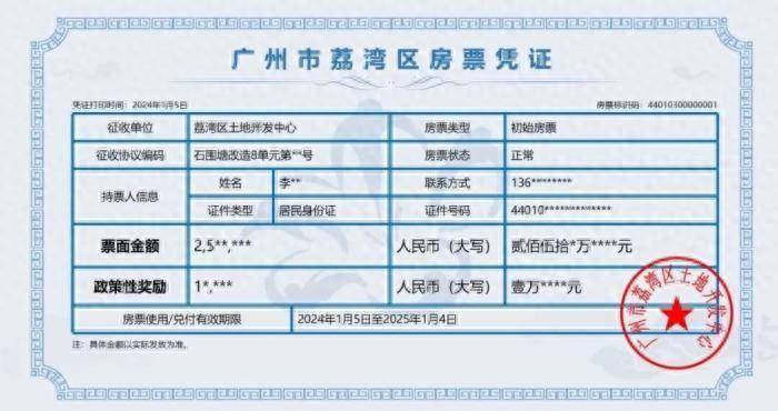 据介绍,荔湾区土地开发中心以石围塘项目为试点,率先落地全市第一批“房票安置”。已发放的房票凭证载明房票类型、购房地址、票面金额、政策性奖励金额、使用/兑付期限等信息,可由本人或其直系亲属购买“定点入库”的新建商品房源。
