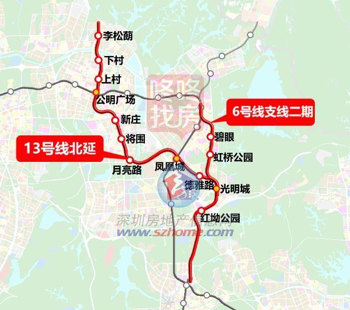 ● 13号线二期北延:红坳公园站、光明城站、德雅路站、凤凰城站、月亮路站、将围站、新庄站、公明广场站、上村站、下村站,李松荫站;