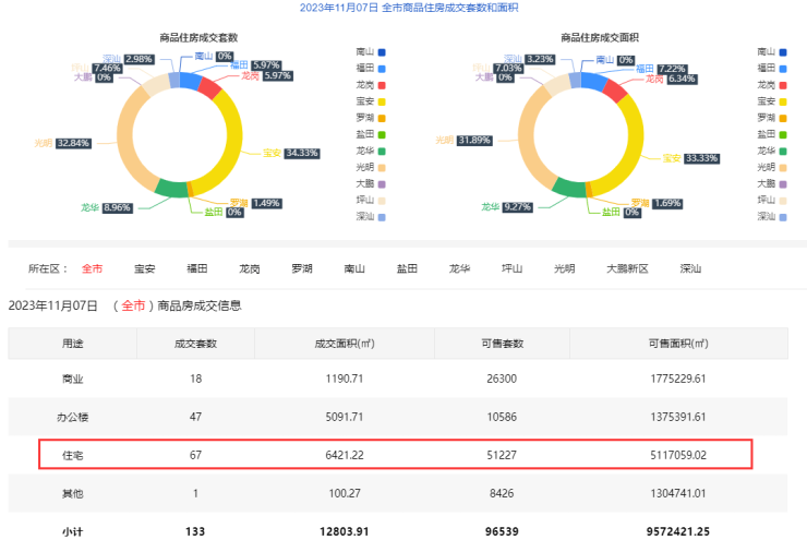 11月7日新房住宅共网签67套。宝安23套;福田4套;龙岗4套;罗湖1套;南山0套;盐田0套;龙华6套;坪山5套;光明22套;大鹏0套;深汕2套。