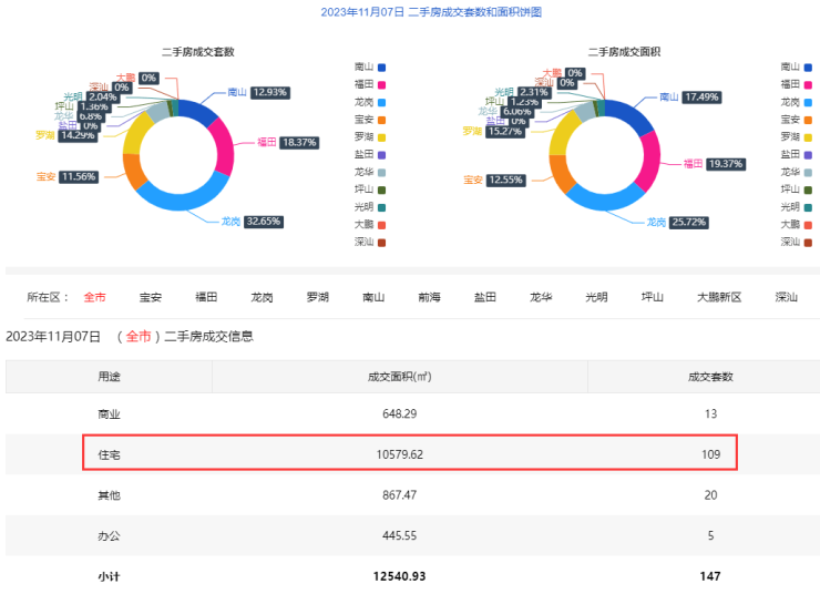 11月7日二手房住宅网签109套。宝安13套;福田23套;龙岗25套;罗湖18套;南山18套;盐田0套;龙华8套;光明3套;坪山1套;大鹏0套。