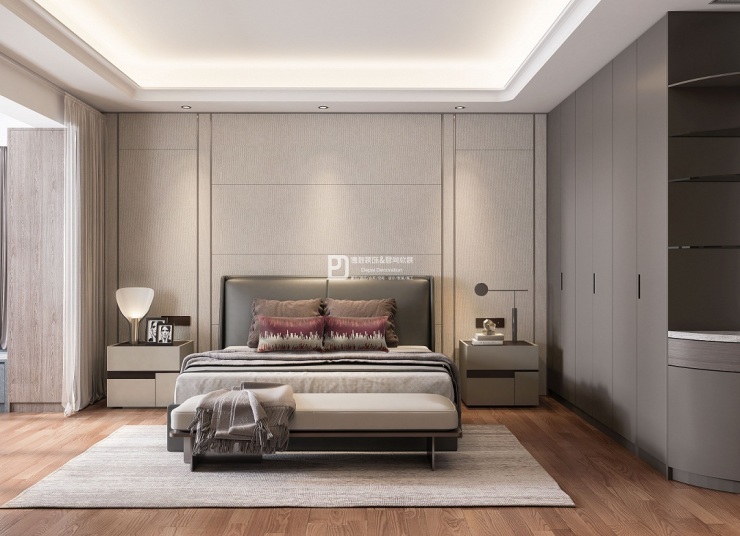 卧室是一个造梦的地方,它是清新雅致的也是具有闲情逸致的;温润的色调,柔和的光线;原木的自然触感在阳光下有一种岁月静好的浪漫。简约的吊顶和护墙板提升了整体色彩的饱和度,融合深灰色的质感,整个空间展现出华贵和内敛。