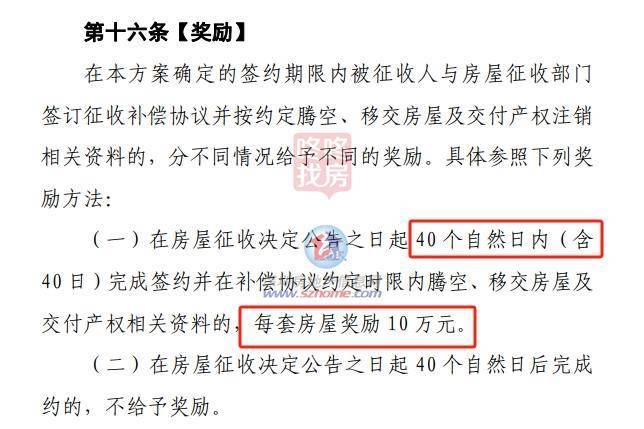 奖励方面,征收决定公告之日起40个自然日内完成签约并在补偿协议约定时限内腾空交房,奖励10万元。