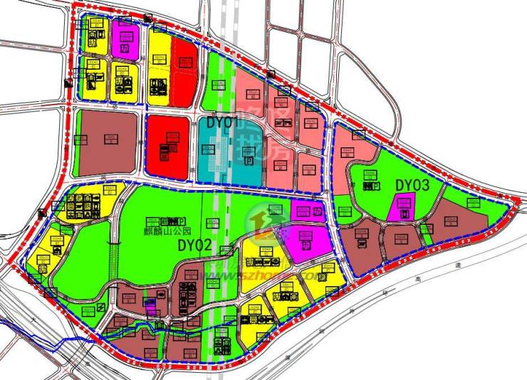 DY02单元,二类居住用地均为现状用地,还有成小片普通工业用地,以及麒麟山公园等公园绿地。