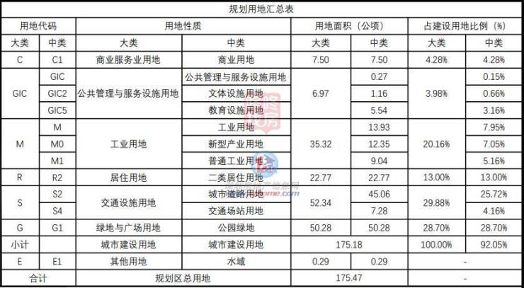 根据规划,居住用地全部为二类居住用地,用地面积22.77公顷,占总建设用地比例的13%;商业服务业用地全部为商业用地,用地面积7.5公顷,占建设用地比例的4.28%;工业用地用地面积35.32公顷,有工业用地、新型产业用地、普通工业用地,占建设用地比例20.16%。