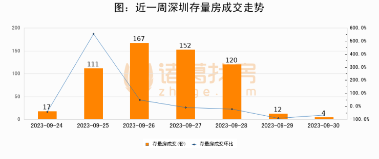 从存量房来看,2023年09月30日深圳存量房单日成交4套,比昨日减少8套,环比下降66.7%。从近一周存量房成交来看,深圳存量房日均成交套数为83套,09月30日单日成交4套,低于近一周平均水平95.2%。