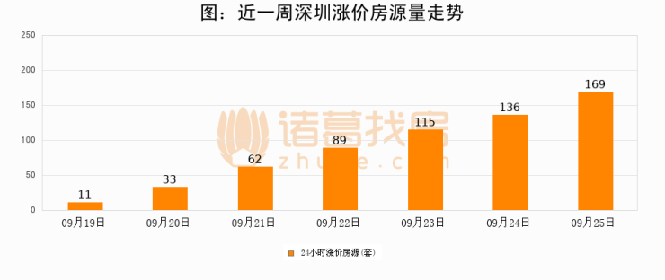 根据诸葛找房数据显示,深圳24小时涨价房源量为169套,较09月24日增加33套,环比上涨24.3%。与此同时,涨价房源占比小幅扩大,业主信心有所提升。