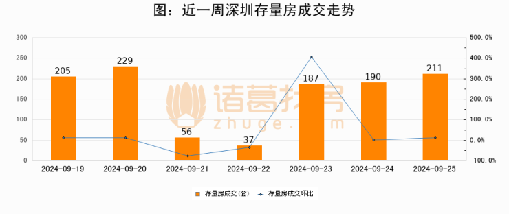 从存量房来看,2024年09月25日深圳存量房单日成交211套,比昨日增加21套,环比上涨11.1%。从近一周存量房成交来看,深圳存量房日均成交套数为159套,09月25日单日成交211套,高于近一周平均水平32.7%。