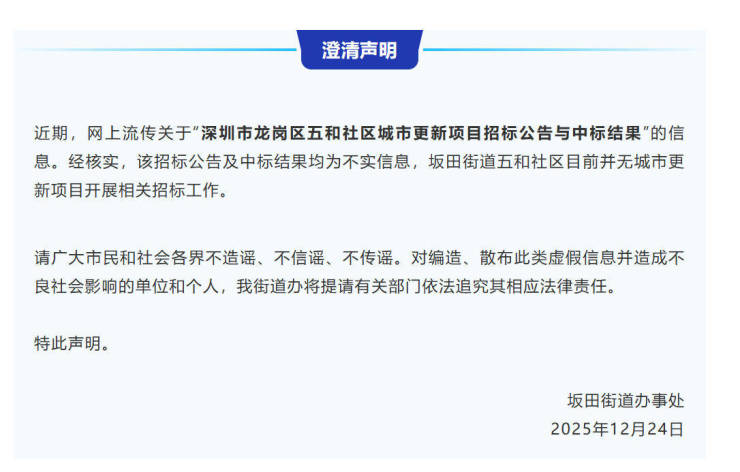深圳市龙岗区五和社区城市更新项目招标公告与中标结果”的信息。经核实,该招标公告及中标结果均为不实信息,坂田街道五和社区目前并无城市更新项目开展相关招标工作。请广大市民和社会各界不造谣、不信谣、不传谣。对编造、…