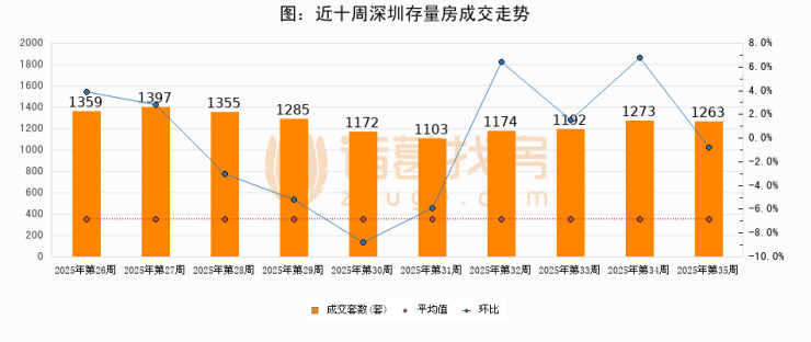 存量房方面,第35周深圳存量房成交1263套,较上周减少10套,环比下降0.8%。从近十周成交走势来看,周均成交套数为1257套,本周高于平均水平0.5%。