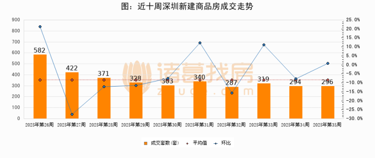 进入2025年第35周(08月25日-08月31日),深圳新建商品房成交296套,较上周增加2套,环比上涨0.7%