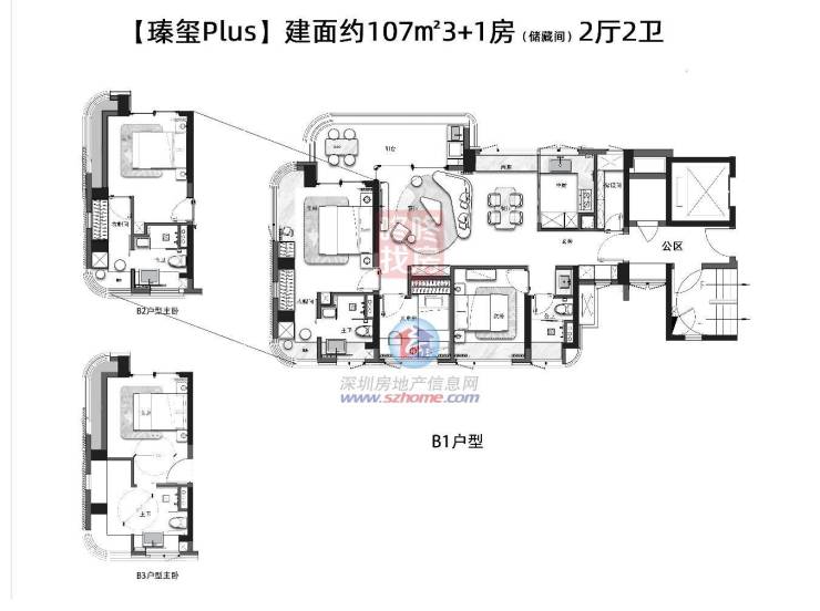瑧玺Plus款:建面约107㎡3+1房(储藏间)2厅2卫(约80套);