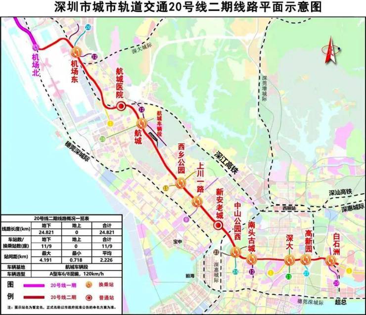 深圳地铁20号线一期起于机场北站,终至会展城站,2021年12月28日通车,是深圳首条全自动运行的地铁。