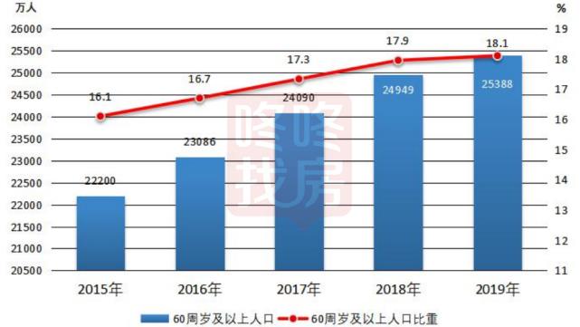 据民政部统计,截至2019年底,全国60周岁及以上老年人口25388万人,占总人口的18.1%,其中65周岁及以上老年人口17603万人,占总人口的12.6%。