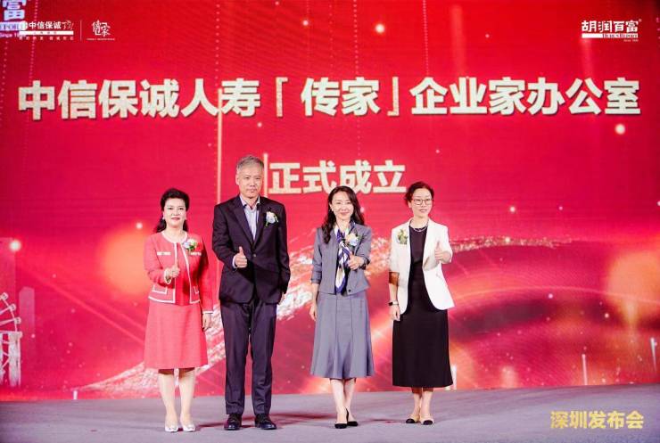 中信金控财富管理委员会董事总经理朱立群、中信保诚人寿副总经理李海、中信保诚人寿高净值业务部总经理危九平、中信保诚人寿深圳分公司总经理陈艳一同上台,共同见证传家企业家办公室正式成立。