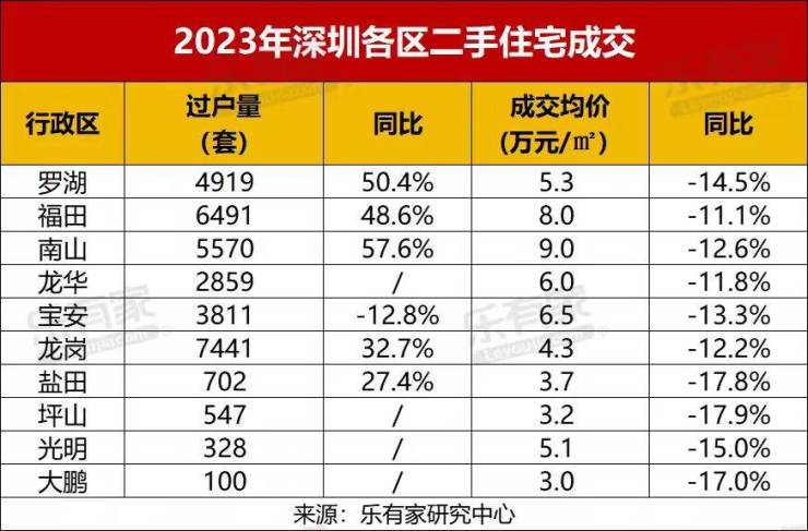 据乐有家发布的数据显示,2023年福田的二手房成交了6491套,居全市第二;而罗湖成绩也不差,共成交了4919套,揽获全市第四名。