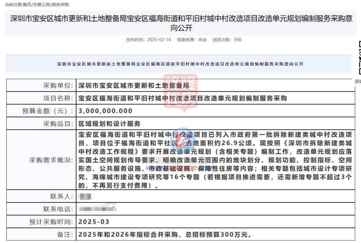 3月,宝安区城市更新和土地整备局也公开了福海街道和平旧村城中村改造项目改造单元规划编制服务采购需求。