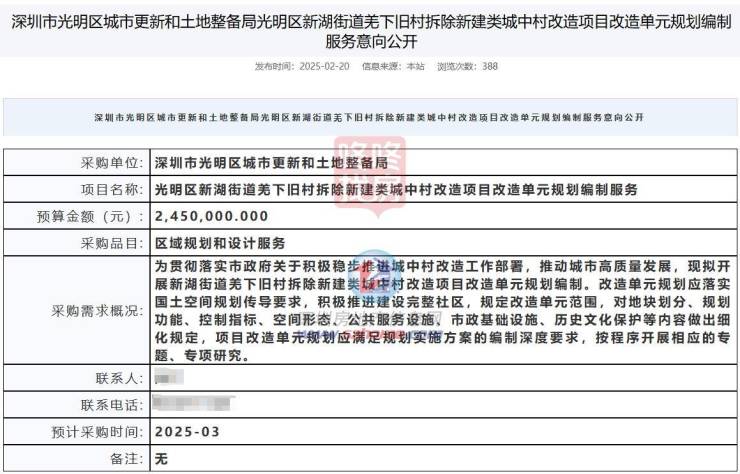2月,光明区城市更新和土地整备局还公开了光明区新湖街道羌下旧村拆除新建类城中村改造项目改造单元规划编制服务采购需求,计划于3月启动采购。