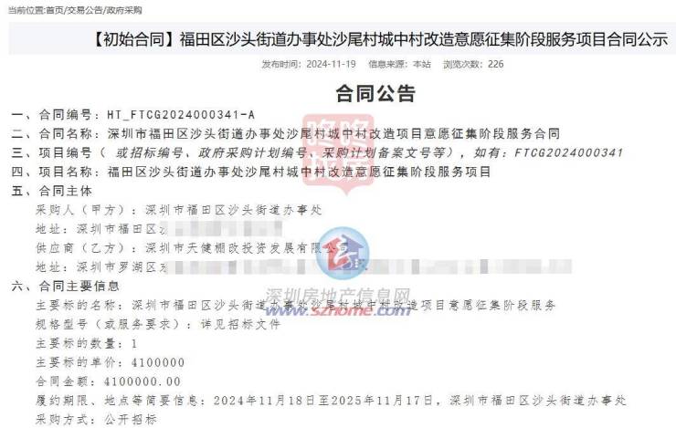 2024年9月,沙头街道办事处开始了沙头街道沙尾村城中村改造项目前期意愿征集服务的采购,2024年11月由天健中标。