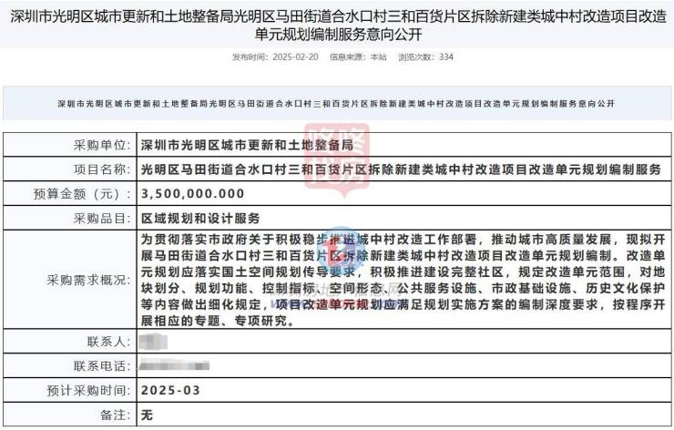 2月,光明区城市更新和土地整备局公开了光明区马田街道合水口村三和百货片区拆除新建类城中村改造项目改造单元规划编制服务采购需求。计划于3月启动采购。