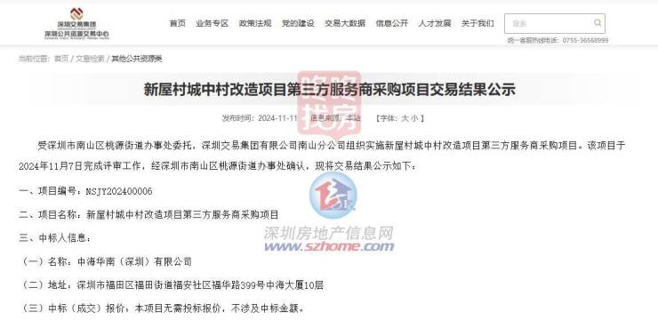 2024年11月,中海中标南山区新屋村城中村改造项目第三方服务商。