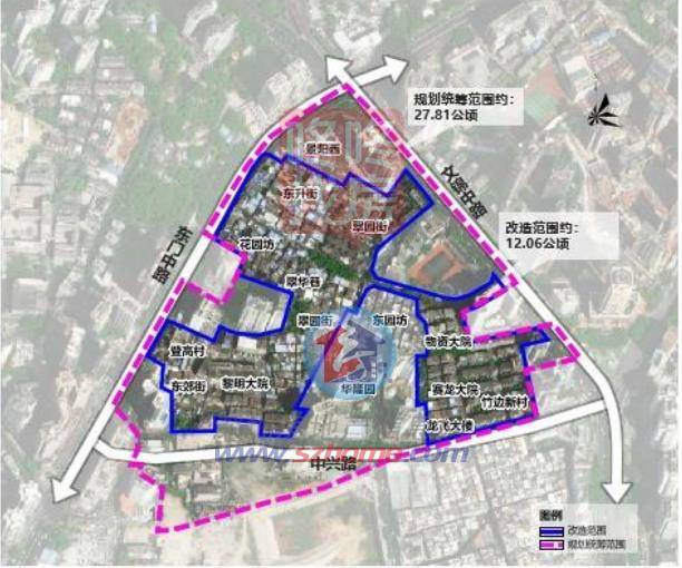 本项目改造范围总占地约12.06万平方米,包括东升街、 花园坊、翠华巷、翠园村、黎明大楼、登高村、黎明小区、 东郊街、翠园路、物资大院、赛龙大院、龙飞大楼、名阳阁、 竹边新村等区域。