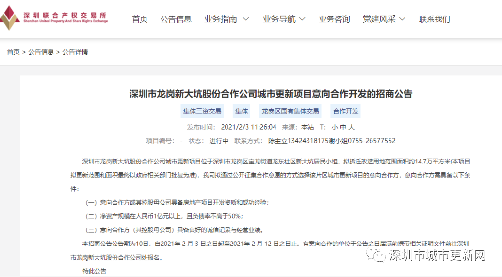 2月3日,深圳联交所发布深圳市龙岗新大坑股份合作公司城市更新项目意向合作开发的招商公告。