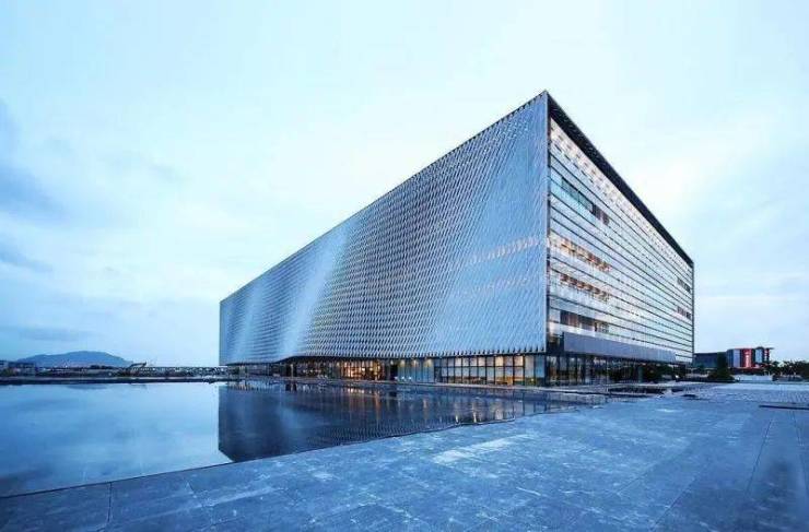 这座矗立在海秀路、海天路和宝兴路交会处的建筑,宛如水波倒影中一本翻开的图书。其外立面采用双层幕墙式设计,东西两面外层的铝合金网状外墙系统随建筑曲线起伏,呈现出织制品般的柔和肌理,光影变化细腻,质感独特。