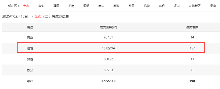 2025年2月13日二手房住宅网签157套。其中,宝安24套;福田19套;龙岗37套;罗湖11套;南山37套;盐田2套;龙华21套;坪山2套;光明4套;大鹏0套。