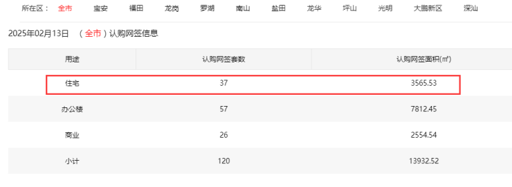 2025年2月13日新房住宅认购网签37套。其中,宝安6套;福田2套;龙岗8套;罗湖1套;南山2套;盐田0套;龙华12套;坪山1套;光明7套;大鹏0套;深汕0套。