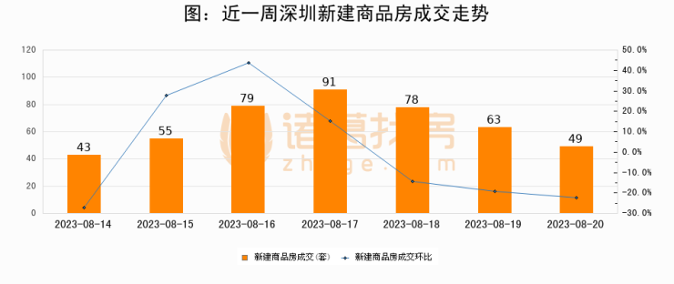 根据深圳市住房和城乡建设局数据显示,2023年08月20日深圳新建商品房成交49套,较昨日减少14套,环比下降22.2%