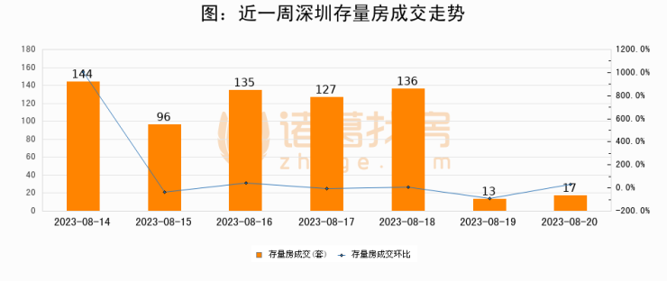 从存量房来看,2023年08月20日深圳存量房单日成交17套,比昨日增加4套,环比上涨30.8%。从近一周存量房成交来看,深圳存量房日均成交套数为95套,08月20日单日成交17套,低于近一周平均水平82.1%。