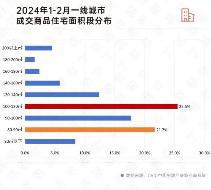 据CRIC监测,重点城市1-2月100-120平方米产品占比居成交首位,比重较去年同期提升1个百分点至25.5%。