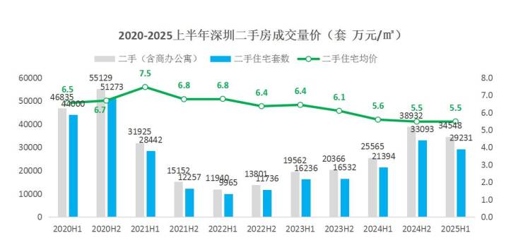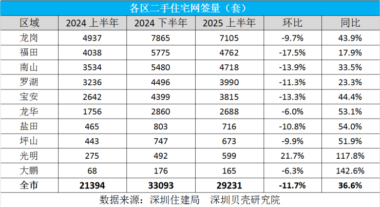 根据深圳贝壳研究院统计,2025上半年全市二手房共成交34548套,同比增长35.1%,环比下降11.3%,其中二手住宅29231套,同比增长36.6%,环比下降11.7%。