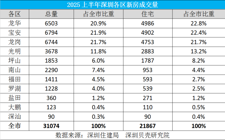 2025上半年,二手房成交量排名前三的区域依然是:龙岗、福田、南山。