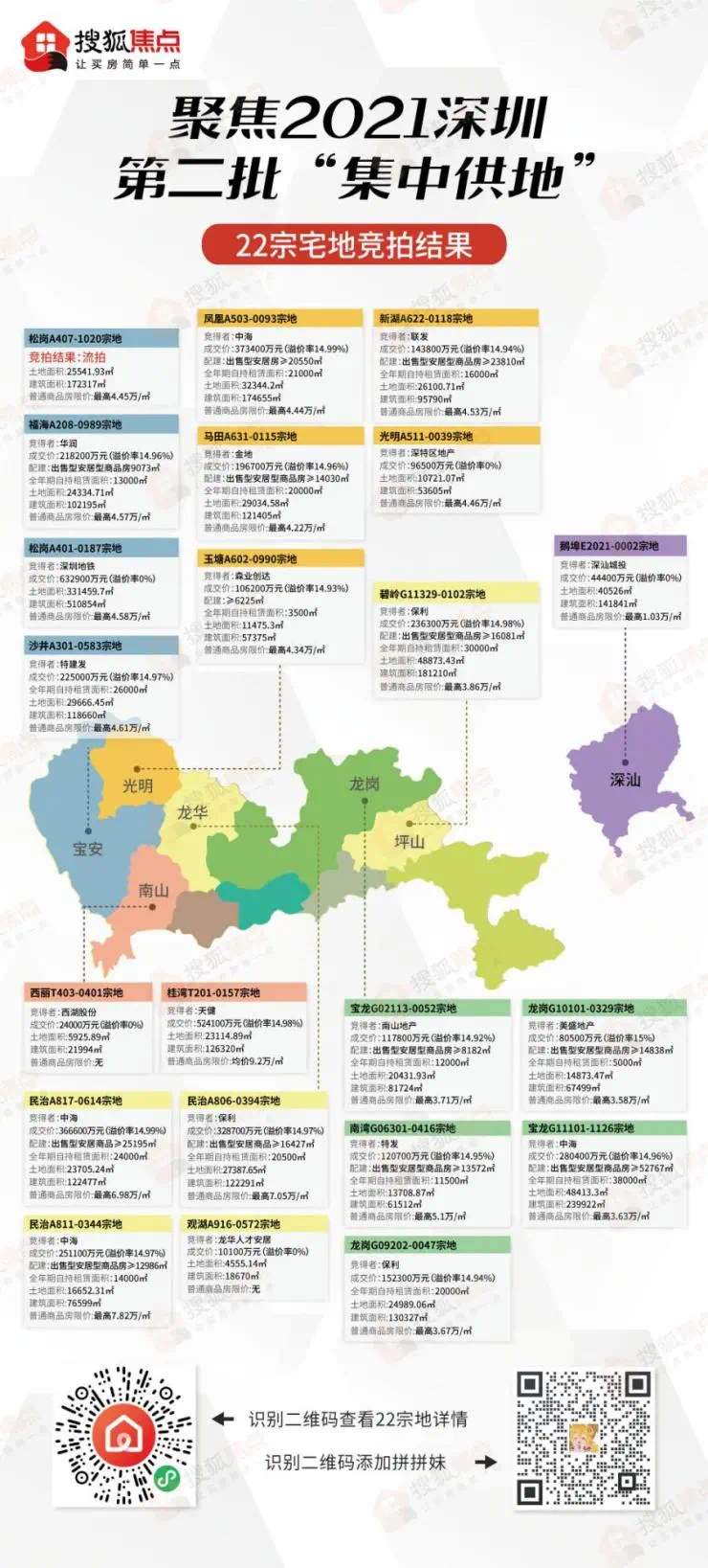 2021年排名前列批集中供应的6宗宅地,4宗普通商品房、2可售人才住房。分布位于光明、龙华、宝安、南山和深汕。虽然仅有6宗地,却吸引了万科、招商、中海、保利、华润、碧桂园等20多家企业参与“角逐”。最终龙华及深汕的3宗底价成交,光明、宝安及南山的3宗溢价率45%成交,溢价率呈两极分化。